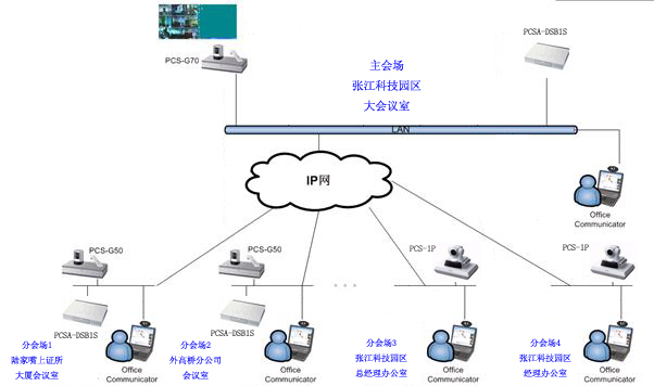 在此方案中,在張江科技園區(qū)大會議室配置一套SONY PCS-G70旗艦型視頻會議終端。并在此終端內(nèi)安裝了支持6點多點會議的H.323內(nèi)置多點MCU。