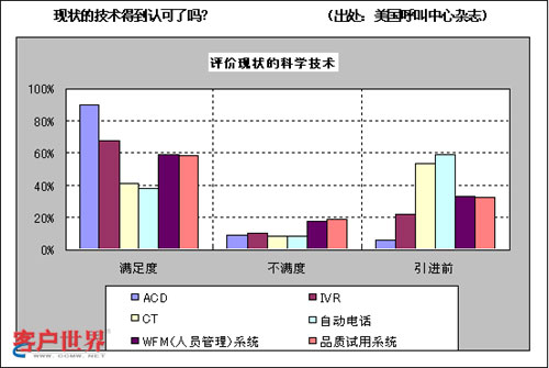 這是調(diào)查美國客服中心的管理者們?nèi)绾卧u價自己公司引進技術(shù)的統(tǒng)計表。雖然“滿意”并不意味著“相關(guān)技術(shù)被有效利用”?墒菑恼{(diào)查結(jié)果來看,他們對技術(shù)的滿意度相當高,并且看起來都在有效利用相關(guān)技術(shù)。