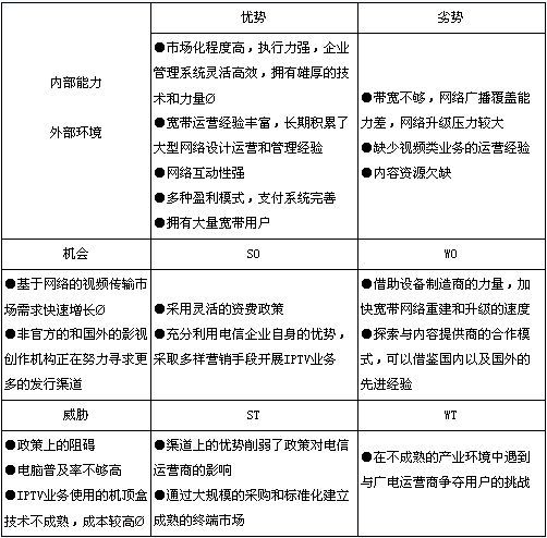 綜上所述,在我國IPTV市場上,電信運營商、廣電運營商、設備商、內(nèi)容提供商等均面臨著激烈競爭,各企業(yè)必須培育起自己的核心競爭力,才能在該市場中占有一席之地。