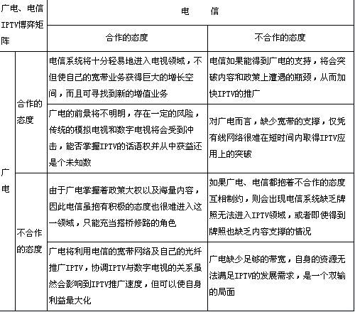 電信、廣電雖然都想爭奪IPTV的主導地位,但通過博弈矩陣可以看出,電信和廣電的互相滲透將是打造成熟的IPTV產(chǎn)業(yè)鏈的必然。廣電運營商具有內(nèi)容優(yōu)勢,電信運營商擁有交互技術(shù)和網(wǎng)絡。廣電網(wǎng)絡的條塊分割決定了廣電運營商豐富的內(nèi)容資源一旦脫離了電信的IP網(wǎng)絡,就很難抓住IPTV的機會;而電信運營商的網(wǎng)絡資源沒有內(nèi)容,也會遭遇發(fā)展瓶頸,惟有廣電和電信合作競爭才是IPTV產(chǎn)業(yè)走向健康發(fā)展的現(xiàn)實選擇。