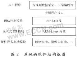 在系統(tǒng)硬件完成后,剩下的需要大量丁作來編寫代碼實(shí)現(xiàn)各個功能模塊,最終實(shí)現(xiàn)整個系統(tǒng)。系統(tǒng)的軟件結(jié)構(gòu)如圖2所示。嵌入式OS是采用ARM-Linux內(nèi)核,硬件驅(qū)動模塊主要是基于ARM
