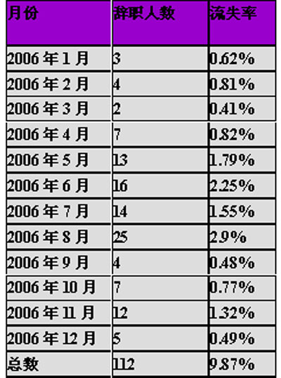 在進(jìn)行收集、分析一些客服中心資料的過(guò)程中,與相關(guān)領(lǐng)導(dǎo)人員進(jìn)行較深入的思想碰撞,尤其是與中國(guó)移動(dòng)江蘇省客服中心副總經(jīng)理張立春的交流,尤為深刻。一組數(shù)據(jù)深深的震撼著我的思想,一是離職率2006年,僅為:9.87%,遠(yuǎn)遠(yuǎn)好于整個(gè)行業(yè)的平均水平;二是員工的心理健康和壓力狀況遠(yuǎn)遠(yuǎn)好于全國(guó)的平均水平;三是客戶(hù)服務(wù)質(zhì)量保持行業(yè)領(lǐng)先地位,各項(xiàng)指標(biāo)具體數(shù)值陳述如下。