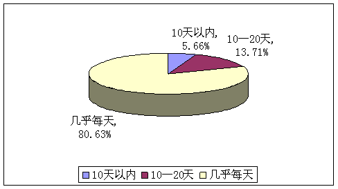 A、10天以內(nèi)(5.66%) B、10—20天(13.71%) C幾乎每天(80.63%)