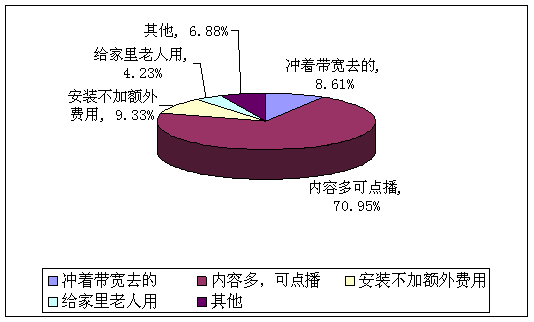 A、沖著帶寬去的(8.61%) B、內(nèi)容多,可點(diǎn)播(70.95%) C、安裝不加額外費(fèi)用(9.33%) D、給家里老人用(4.23%)E、其他(6.88%)