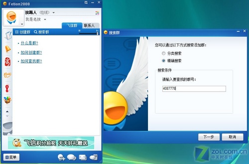 在圖4中,切換到“飛信群”選項,單擊“搜索群”按鈕,在彈出的“搜索群”對話框中點選“精確搜索”,最后輸入“群號碼”并單擊“下一步”按鈕(如圖10)。