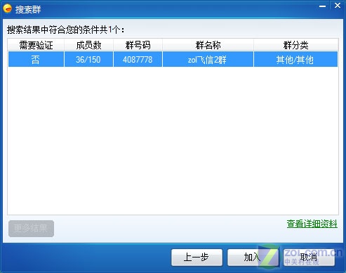 如果你搜索的群已經(jīng)存在,那么程序?qū)谐鏊阉鞯饺禾,選中后單擊“加入”即可(如圖11)。