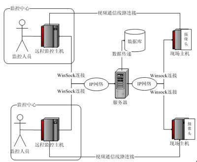 本系統(tǒng)基于瘦客戶端的C/S模式,在體系結(jié)構(gòu)上采用以服務(wù)器為中心的星型結(jié)構(gòu),創(chuàng)新性地把監(jiān)控現(xiàn)場端和監(jiān)控中心端C角色化。即在本系統(tǒng)中所有的監(jiān)控現(xiàn)場端和監(jiān)控中心端相對(duì)整個(gè)系統(tǒng)的架構(gòu)而言都是客戶端,它們的通信都需要經(jīng)過服務(wù)器的驗(yàn)證中轉(zhuǎn)。同時(shí),監(jiān)控中心使用者的登錄由于這種架構(gòu)模式,也必須要經(jīng)過服務(wù)器的驗(yàn)證才能成功登錄,進(jìn)而獲得監(jiān)控的權(quán)利。