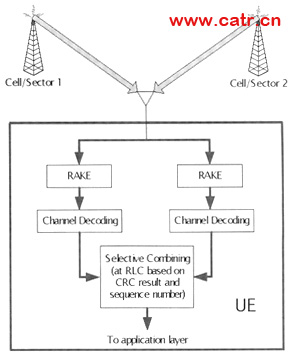 當(dāng)終端用戶移動到不同基站下的小區(qū)分界處時候,采用宏分集技術(shù)同時接收來自兩個基站的電視數(shù)據(jù)(見圖3)。在實(shí)現(xiàn)宏分集技術(shù)時,要求網(wǎng)絡(luò)側(cè)針對同一MBMS業(yè)務(wù)在兩小區(qū)間進(jìn)行內(nèi)容同步和一定程度上的時間同步。
