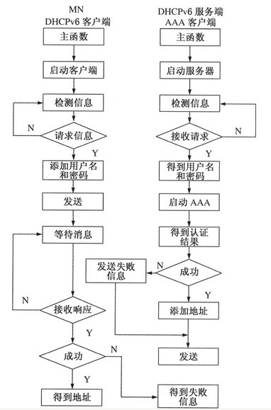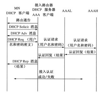 當DHCPv6服務(wù)器調(diào)用子進程執(zhí)行AAA客戶端程序后,AAA客戶端將把從MN傳過來的密碼和用戶名添加到認證請求選項中,向AAAL進行認證。AAAL將收到的消息轉(zhuǎn)發(fā)給AAAH服務(wù)器,AAAH收到認證請求后進行認證。如用戶名和密碼正確,則返回Accecpt響應(yīng)消息,標志認證成功;如用戶名或者密碼錯誤,則返回Reject響應(yīng)消息,標志認證失敗。AAAL收到認證回復(fù)消息后記錄認證信息,下次認證時只需詢問AAAL,減少認證步驟。