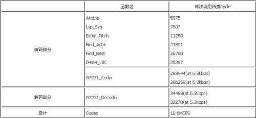 經(jīng)過C語言級(jí)和匯編級(jí)的多種優(yōu)化,最后實(shí)現(xiàn)了一路G.723.1的編解碼需要花費(fèi)10.6MCPS,整個(gè)代碼的程序空間為208K byte(程序中包括了部分c6201的庫(kù)函數(shù)),數(shù)據(jù)空間為8K byte,碼本大小20k byte,多通道的上下文數(shù)據(jù)為1.48K byte。200MHz的C6201每秒可以實(shí)時(shí)編解碼16路語音信號(hào)。所有代碼全部通過了ITU-T測(cè)試矢量的測(cè)試。表1是各主要模塊的運(yùn)算量。