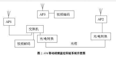 為了保證APM移動(dòng)視頻監(jiān)控系統(tǒng)的整體性能,筆者就APM系統(tǒng)無(wú)線網(wǎng)絡(luò)和視頻編碼器的各自性能,進(jìn)行了實(shí)驗(yàn)。本次實(shí)驗(yàn)采用兩個(gè)步驟,即實(shí)驗(yàn)室測(cè)試和現(xiàn)場(chǎng)模擬實(shí)驗(yàn)測(cè)試,并在實(shí)驗(yàn)室測(cè)試的基礎(chǔ)上,對(duì)無(wú)線網(wǎng)絡(luò)和視頻編碼器間的初步配合進(jìn)行現(xiàn)場(chǎng)實(shí)驗(yàn)測(cè)試,F(xiàn)場(chǎng)的實(shí)驗(yàn)系統(tǒng)組成如圖2所示。