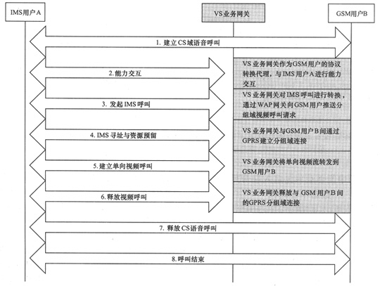 步驟5:建立視頻呼叫。此時(shí)IMS用戶A可向GSM用戶傳送視頻流。不過(guò)視頻流不是直接在兩個(gè)用戶間傳送,視頻流首先傳送到VS業(yè)務(wù)網(wǎng)關(guān),由VS業(yè)務(wù)網(wǎng)關(guān)實(shí)時(shí)轉(zhuǎn)發(fā)給GSM用戶B。