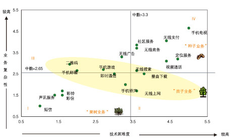 根據(jù)“業(yè)務(wù)復(fù)雜性—技術(shù)困難度”模型,可以清晰地看到一個(gè)業(yè)務(wù)的成功商用和業(yè)務(wù)復(fù)雜性與技術(shù)困難度密切相關(guān),如短信和彩鈴等復(fù)雜性與技術(shù)困難度都很低的業(yè)務(wù)是比較容易成功商用的,將這一類業(yè)務(wù)歸類為“果樹業(yè)務(wù)”,在第一象限(象限I)。還有一些業(yè)務(wù)如即時(shí)通信、整曲下載和無線搜索等業(yè)務(wù),已經(jīng)開始快速增長但是其用戶規(guī)模和收入量都還低于“果樹業(yè)務(wù)”,在業(yè)務(wù)復(fù)雜性與技術(shù)困難度坐標(biāo)中這類業(yè)務(wù)處于4個(gè)象限交匯的中部區(qū)域(即圖中黃色區(qū)域),由于業(yè)務(wù)復(fù)雜性和技術(shù)困難度都會(huì)隨時(shí)間而減小,從而這一區(qū)域的業(yè)務(wù)會(huì)向第一象限演進(jìn),這類業(yè)務(wù)稱為“苗子業(yè)務(wù)”,即在3年內(nèi)能夠成熟的業(yè)務(wù)。在坐標(biāo)系的右上角第四象限,即業(yè)務(wù)復(fù)雜性和技術(shù)困難度均較高的業(yè)務(wù),稱之為“種子業(yè)務(wù)”,這類業(yè)務(wù)在短期內(nèi)很難快速成長。