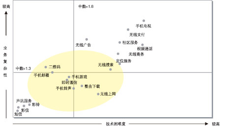 諾基亞西門子通信借鑒國外的無限增值業(yè)務(wù)經(jīng)驗(yàn)和對(duì)國內(nèi)運(yùn)營商業(yè)務(wù)的分析提出“技術(shù)困難度—業(yè)務(wù)復(fù)雜性”模型來詮釋無線增值業(yè)務(wù)。