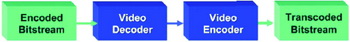 視頻轉(zhuǎn)碼是一個高運(yùn)算負(fù)荷的過程,需要對輸入的視頻流進(jìn)行全解碼、視頻過濾/圖像處理、并且對輸出格式進(jìn)行全編碼。最簡單的轉(zhuǎn)碼過程(圖3)僅僅涉及到解碼一個比特流和用不同的編解碼器重新編碼兩個步驟。這種硬轉(zhuǎn)碼看似很簡單,只需要一個解碼器和一個編碼器,但是最終顯示結(jié)果并不理想,因為視頻數(shù)據(jù)解碼后重新編碼會降低畫質(zhì)。