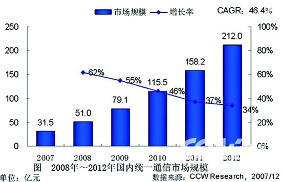 國內(nèi)外市場分析機(jī)構(gòu)先后推出關(guān)于統(tǒng)一通信的調(diào)查報(bào)告和分析預(yù)測: 計(jì)世資訊今年6月發(fā)布的最新報(bào)告顯示,2008年國內(nèi)統(tǒng)一通信的市場規(guī)模將達(dá)到51億元人民幣,而從2008年到2012年,在未來五年的時間里,國內(nèi)統(tǒng)一通信市場將保持較快的增長趨勢,年復(fù)合增長率將達(dá)到46.4%,截至2012年,國內(nèi)統(tǒng)一通信市場的規(guī)模將達(dá)到212億元人民幣。