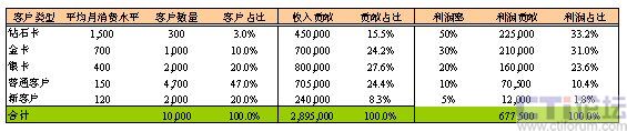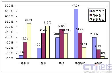 因為高端客戶在利潤貢獻中所起的巨大作用,通過簡單的計算即可得出,每一名鉆石卡客戶流失帶來的利潤損失,相當于9.4名銀卡客戶流失帶來的損失,或相當于50名普通客戶流失帶來的損失,或相當于125名新用戶流失帶來的直接損失。