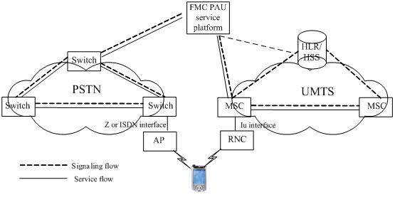 在FMC-PAU中,移動(dòng)終端屬于雙;蚨嗄=K端,用戶使用該終端既可以接入到3G移動(dòng)網(wǎng),也可以采用無(wú)線方式通過(guò)接入節(jié)點(diǎn)(AP)接入到PSTN網(wǎng)絡(luò)中。