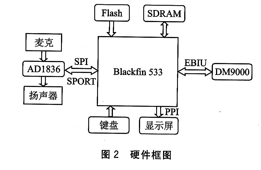 Blackfin 533為核心處理器芯片。外圍輔以ADl836實現語音信號的采集和播放;DM9000實現網絡數據包的收發(fā);TFT