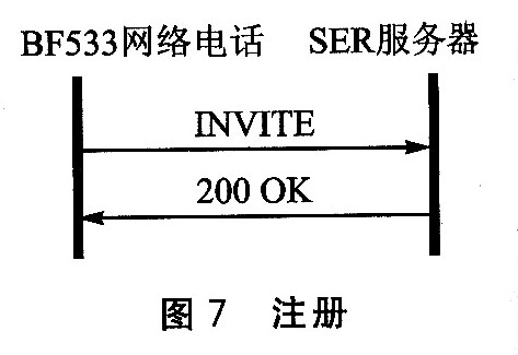 注冊過程如圖7所示。BF533網絡電話和SER服務器共交換了兩條消息:一條是目標系統向服務器發(fā)送的REGISTER請求消息,另一條是服務器發(fā)送的200