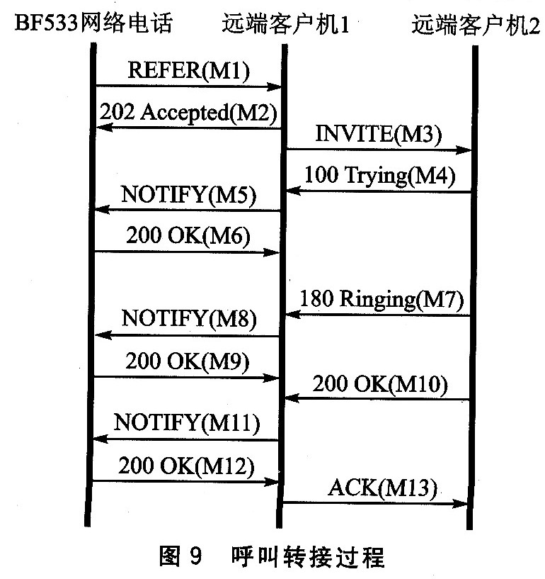 該過程是通過擴展的SIP信令REFER來完成的,交互過程如圖9所示。當BF533網絡電話要將它和遠端客戶機1(RCl)的通話轉接到遠端客戶機2(RC2)時,BF發(fā)送REFER(M1)給RCl,該信息中Refer—To字頭標明了RC2的URL,之后RCl回復202