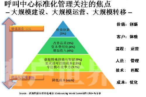 那么,對(duì)于這個(gè)尚處在”嬰兒潮”時(shí)期的產(chǎn)業(yè),我們最應(yīng)該做些什么來(lái)呵護(hù)和培育這個(gè)產(chǎn)業(yè)健康有序的發(fā)展?大家要好好呵護(hù)這個(gè)行業(yè)。如果只是強(qiáng)調(diào)“要想讓呼叫中心發(fā)展,那就需要我們多投錢(qián),這樣就能買(mǎi)許多機(jī)器,放在公司里面。規(guī)格有了,那呼叫中心就發(fā)展了!蔽矣X(jué)得這樣的說(shuō)法是對(duì)呼叫中心發(fā)展的錯(cuò)誤理解。我們這個(gè)標(biāo)準(zhǔn)是希望營(yíng)建專(zhuān)業(yè)化的產(chǎn)業(yè),整個(gè)呼叫中心產(chǎn)業(yè)的價(jià)值金字塔,這個(gè)金字塔每年在美國(guó)有一個(gè)專(zhuān)場(chǎng),就叫呼叫中心專(zhuān)場(chǎng),標(biāo)志一個(gè)產(chǎn)業(yè)成熟的金字塔是怎樣的。通過(guò)調(diào)查發(fā)現(xiàn),當(dāng)產(chǎn)業(yè)進(jìn)入成熟階段,標(biāo)準(zhǔn)化服務(wù)的第一個(gè)就是降低成本,也就是提高生產(chǎn)效益,能夠把這個(gè)產(chǎn)業(yè)細(xì)化分解,高度的模塊化進(jìn)行精細(xì)控制的時(shí)候,其他的差異化的體現(xiàn)。呼叫中心本身是不是成為企業(yè)核心競(jìng)爭(zhēng)力的一部分,或者說(shuō)越來(lái)越成熟的外包商出現(xiàn),能夠把一些企業(yè)非核心競(jìng)爭(zhēng)力加入到自己的核心競(jìng)爭(zhēng)力之上,這叫專(zhuān)業(yè)化。還有一個(gè)更加靈活可控的成本,呼叫中心的彈性從一百人到一千人,一千人到三千人的發(fā)展更加可控。還有獲得特殊技能與知識(shí),事實(shí)上呼叫中心各行各業(yè)知識(shí)都會(huì)接觸,你只有專(zhuān)著才能做得更好,本身對(duì)于呼叫中心的從業(yè)人員來(lái)說(shuō),在這個(gè)產(chǎn)業(yè)中扮演的角色不是締造一個(gè)企業(yè)的核心競(jìng)爭(zhēng)力,怎么期望從業(yè)人員掌握更多的技能和知識(shí),來(lái)指導(dǎo)更多的行業(yè)和企業(yè)。特別是在客戶導(dǎo)向上面的發(fā)展,還有在金字塔上面增加收入,分析客戶所需,讓我們更好的滿足客戶的需求;然后資本費(fèi)用化,從外包專(zhuān)業(yè)化領(lǐng)域帶來(lái)的變化,很多的時(shí)候最大的一筆建設(shè)是呼叫中心,基本一個(gè)中等的呼叫中心沒(méi)有500萬(wàn)以上的資金投入是不可想象的。
