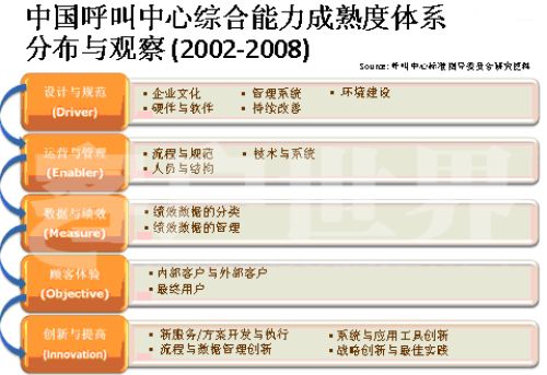 在過(guò)去幾年我們也做了很多研究,一個(gè)呼叫中心整合持續(xù)建設(shè)在哪些方面應(yīng)該做定義。基本上我們是分為五個(gè)方面,在每一級(jí)的成熟度方面,我們的呼叫中心都關(guān)注自己的成熟度。1、設(shè)計(jì)與規(guī)范;2、運(yùn)營(yíng)管理;3、數(shù)據(jù)與績(jī)效;4、顧客體驗(yàn);5、創(chuàng)新與提高。第五方面創(chuàng)新與提高在CMM模型中是特有的,它在整個(gè)產(chǎn)業(yè)的發(fā)展過(guò)程中,提供戰(zhàn)略革新和戰(zhàn)略工具一體化使用的指導(dǎo)框架和最佳實(shí)踐。