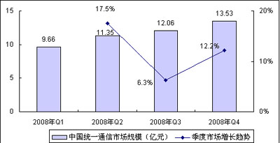 賽迪顧問(wèn)預(yù)測(cè),2008年全年中國(guó)統(tǒng)一通信市場(chǎng)都將保持快速的增長(zhǎng)勢(shì)頭,雖然第三季度增長(zhǎng)趨勢(shì)有所放緩,全球金融海嘯的反作用將進(jìn)一步提高企業(yè)對(duì)統(tǒng)一通信產(chǎn)品的認(rèn)知,促進(jìn)中國(guó)統(tǒng)一通信市場(chǎng)的發(fā)展,第四季度市場(chǎng)將出現(xiàn)反彈趨勢(shì),增長(zhǎng)速度超過(guò)12%,市場(chǎng)規(guī)模13.53億元,2008年全年中國(guó)統(tǒng)一通信市場(chǎng)規(guī)模將達(dá)到46.6億元,同比增長(zhǎng)超過(guò)50%。