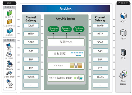 通過基于AnyLink的電子渠道統(tǒng)一接口平臺解決方案提供各類網(wǎng)關(guān)功能,可實(shí)現(xiàn)各種系統(tǒng)的整合,還提供報文轉(zhuǎn)換及路由的中介功能、管理和監(jiān)控所需的GUI工具,實(shí)現(xiàn)系統(tǒng)運(yùn)營和維護(hù)及開發(fā)的最佳化(如圖所示)。