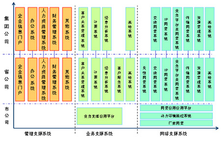 從系統(tǒng)的部署來(lái)看,主要集中在集團(tuán)與省公司,其中,集團(tuán)公司系統(tǒng)主要具備面向全公司的企業(yè)管理、經(jīng)營(yíng)分析等功能;省公司從以職能管理為主逐步轉(zhuǎn)變?yōu)橐陨a(chǎn)管理為主,具有了越來(lái)越多的生產(chǎn)職能,在運(yùn)營(yíng)支撐系統(tǒng)建設(shè)中的作用更加突出;市公司的生產(chǎn)管理職能有所削弱,將主要負(fù)責(zé)市場(chǎng)的具體營(yíng)銷、客戶支撐以及設(shè)備的現(xiàn)場(chǎng)維護(hù)等工作。現(xiàn)有系統(tǒng)主要存在以下幾個(gè)問(wèn)題:
