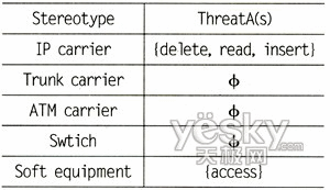針對圖1中定義的定型以及對網(wǎng)絡(luò)安全構(gòu)成威脅的攻擊者的類型,可以定義出威脅函數(shù)TheatA(s)。其中A表示攻擊者類型,這里假定攻擊者為具備一般能力的外部攻擊者,即其可以竊聽到廣播信道上的數(shù)據(jù)流量,并可以插入或刪除數(shù)據(jù)流量,能夠利用系統(tǒng)漏洞入侵系統(tǒng);表示為模型中定義的定型威脅函數(shù)的值域?yàn)閧delete,read,insert,access}。根據(jù)NGN中承載網(wǎng)絡(luò)和計(jì)算節(jié)點(diǎn)的特性,我們可以得出如下威脅函數(shù),如表1所示。