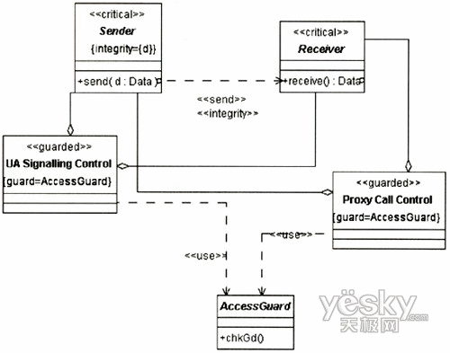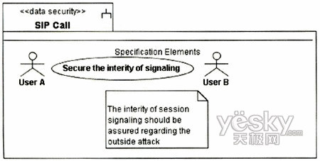圖3中的UA代表UserA或UserB的UA,因?yàn)閮蓚(gè)UA的信令交互需要通過Proxy,且其安全需求是一致的,故在圖中只表現(xiàn)出一方。UA和Proxy均是基于通用計(jì)算平臺的節(jié)點(diǎn),其訪問控制需要受到保護(hù),故對其標(biāo)記上定型《guardedaccess》。UA中除處理信令外,還需處理媒體流的編解碼與控制,這個(gè)用例中只涉及信令的安全性,故在UA中只關(guān)注進(jìn)行信令控制的組件。UA與Proxy之間的通信基于IP承載,根據(jù)表1定義的威脅函數(shù):ThreatA(IP