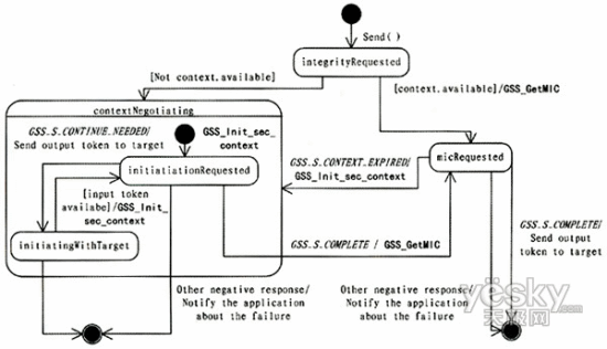 下面說明如何利用GSS-API實(shí)現(xiàn)保證通信完整性的安全能力抽象類,通過狀態(tài)圖說明保證通信完整性的Sender類的send()方法及Receiver類的receive()方法的GSS-API實(shí)現(xiàn)。本文中給出的是一個(gè)示意性的說明,忽略了一些錯(cuò)誤處理過程。