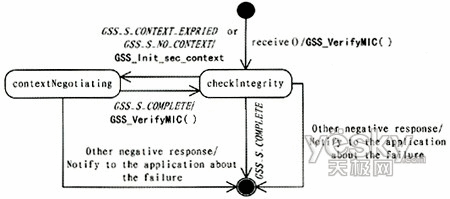 圖6中,在send()方法被調(diào)用后,Sender首先檢測是否已有可用的安全上下文,如果可用的安全上下文已經(jīng)存在,則可以利用該上下文的句柄作為參數(shù)之一,調(diào)用GSS-API的Get_GetMIC()方法。參數(shù)還包括有待進(jìn)行簽名的消息和可選的QoP。如果對消息簽名可以正常完成,Sender就可以將消息與簽名后生成的token一起送到目的地。如果簽名發(fā)生異常,則可以通過返回的錯(cuò)誤碼判斷原因。