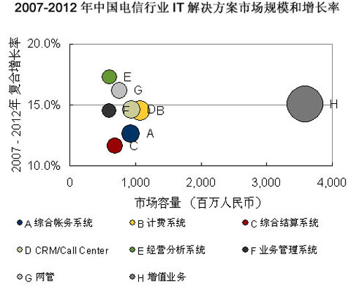 巨大的電信市場蛋糕給產(chǎn)業(yè)鏈的各級廠商都帶來良好的發(fā)展機遇,而其運營支撐系統(tǒng)市場無疑將是增長最快的一部分。據(jù)市場調查機構IDC預計,2007年-2012年電信行業(yè)將注重運營支撐系統(tǒng)的全業(yè)務運營整合和支持前端業(yè)務,因此3G增值業(yè)務、經(jīng)營分析系統(tǒng)、客戶關系管理系統(tǒng)、IT服務管理系統(tǒng)等建設將實現(xiàn)快速增長。運營商的已有項目仍然會持續(xù)升級維護,以及配合全業(yè)務運營作出功能上的提升。IDC預計,2012年電信行業(yè)IT解決方案整體市場規(guī)模將達到193.5億元人民幣。