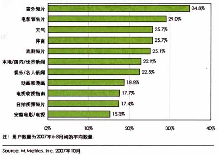 M:Metrics針對美國手機用戶的研究數(shù)據(jù)顯示,美國手機用戶在訂閱手機電視內(nèi)容時偏愛娛樂類的內(nèi)容,其中音樂短片、電影預(yù)告片是用戶需求最大的手機電視內(nèi)容,另外受到歡迎的是與生活相關(guān)的內(nèi)容及新聞內(nèi)容。