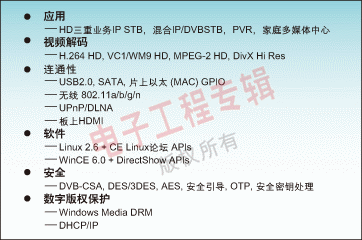 H.264、WM9、AVS的STB810平臺和用于HD H.264 a和VC1的STB225平臺。IP-STB平臺應(yīng)該提供一個驗(yàn)證核技術(shù),例如NXP公司基于Nexperia技術(shù)的平臺,并且每一個研發(fā)工具都向后兼容。