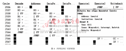 VIEWER工具,如圖4所示。在編寫完成匯編代碼后,可使用該工具觀察運(yùn)行時(shí)流水線的情況。如果有stall等出現(xiàn),會(huì)給出原因,優(yōu)化人員根據(jù)工具分析結(jié)果重新更改代碼,提高執(zhí)行效率。