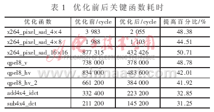 采用以上優(yōu)化方法對(duì)編碼關(guān)鍵函數(shù)進(jìn)行優(yōu)化,優(yōu)化前后函數(shù)耗時(shí)如表1所示。可見,以上優(yōu)化方法能大幅度減少編碼時(shí)間。