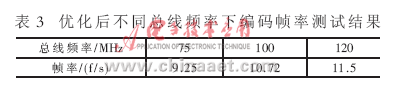對(duì)于不同的總線頻率,優(yōu)化后編碼幀率不同,結(jié)果如表3所示,采用的測(cè)試序列為foreman。