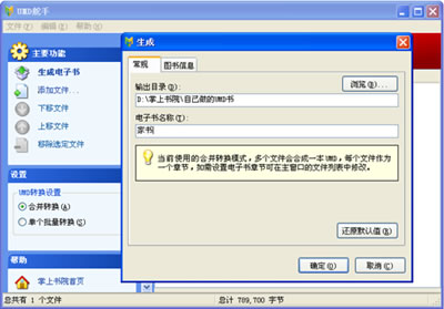 點(diǎn)擊“添加文件”,將你想要轉(zhuǎn)換的電子書添加至軟件窗口,大批量轉(zhuǎn)換的用戶可一次性選中多個(gè)文件添加,添加完畢后,你可以隨時(shí)通過“上移文件”和“下移文件”按鈕來(lái)調(diào)整你文件擺放的位置,或者移除不需要轉(zhuǎn)換的文件。確認(rèn)后,選擇合并轉(zhuǎn)換或是單個(gè)批量轉(zhuǎn)換,合并轉(zhuǎn)換是將添加的文件合并成一本UMD電子書,單個(gè)批量轉(zhuǎn)換是每個(gè)文件生成一本UMD電子書。設(shè)置完后點(diǎn)擊“生成電子書”,在彈出的對(duì)話框中設(shè)置輸出目錄、電子書名稱、電子書封面、作者、來(lái)源后點(diǎn)擊確認(rèn),出現(xiàn)正在轉(zhuǎn)換的進(jìn)度條,完成制作后會(huì)自動(dòng)打開電子書所在的目錄,你的電子書制作完成,是不是非常簡(jiǎn)單。