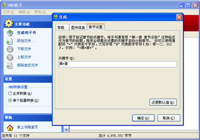 對(duì)于單個(gè)批量轉(zhuǎn)換的用戶而言,UMD舵手擁有智能斷章功能,完美解決了TXT電子書在手機(jī)上無(wú)法分章的難題。在“章節(jié)設(shè)置”選項(xiàng)卡中輸入用于制作章節(jié)目錄的關(guān)鍵字。例如:1、“第一章華山論劍”,則輸入的關(guān)鍵字可為:“第*章”;“一、華山論劍”,則輸入的關(guān)鍵字可為:“N、”;“【華山論劍】”,則輸入的關(guān)鍵字可為:“【*】”;“1-3-5節(jié):華山論劍”,則輸入關(guān)鍵字可為:“N-N-N