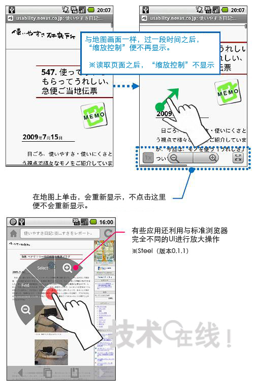圖片說明: 利用不同操作調出同一工具為在Android的標準瀏覽器(上面的兩個畫面)上調出縮放畫面顯示的工具(縮放控制),用手指拖拽畫面(向一個方面滑動)。為利用地圖應用軟件調出同一工具,需要輕敲畫面(敲擊)能從在Android市場上下載的瀏覽器(下面的畫面)有能夠利用完全不同的UI縮放畫面的工具。