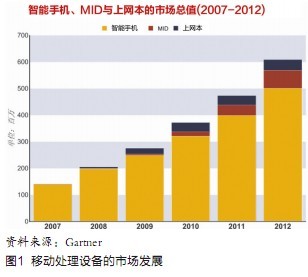隨著3G對(duì)移動(dòng)信息處理的促進(jìn),未來幾年,MS市場(chǎng)尤其是智能化接入設(shè)備市場(chǎng)的增長將非常迅速,根據(jù)有關(guān)機(jī)構(gòu)的分析,智能手機(jī)、MID、上網(wǎng)本等移動(dòng)上網(wǎng)裝置從2007年至2012年的年復(fù)合成長率將達(dá)到36%,而到2012年為止,市場(chǎng)上將會(huì)有超過6億部的移動(dòng)終端,如圖1所示,藉由3G移動(dòng)通信和WLAN的帶動(dòng),移動(dòng)接入設(shè)備將實(shí)現(xiàn)從人手一部向人手兩部甚至多部的方向邁進(jìn)。