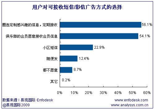 從用戶對(duì)短信廣告的接受程度來看,用戶對(duì)于自己感興趣領(lǐng)域的短信廣告并不反感,甚至樂于接受或定制。根據(jù)易觀國(guó)際Enfodesk發(fā)布的用戶調(diào)研數(shù)據(jù),56.1%的用戶愿意定制自己感興趣的信息,54.1%的用戶愿意接受會(huì)員信息,只有8.7%的用戶不愿意接受任何形式的短信/彩信廣告。但是這類用戶樂于接受的短信廣告反而一般有固定的端口號(hào),更容易被攔截,因此易觀國(guó)際(Analysys