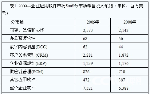 在Gartner的統(tǒng)計(jì)中,SaaS領(lǐng)域中,除了CRM之外,內(nèi)容、通訊和協(xié)作市場(chǎng)同樣表現(xiàn)不俗,在2009年,這一市場(chǎng)的銷(xiāo)售收入將從2008年的21.4億美元增長(zhǎng)到26億美元,甚至超過(guò)了CRM分市場(chǎng)的23億美元。其他如ERP分市場(chǎng)等同樣占據(jù)不小的份額。