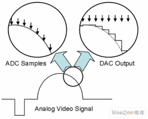由攝像機或其他設備捕獲的模擬視頻信號通過模/數(shù)轉(zhuǎn)換器(ADC)進行數(shù)字化處理,它在每個時鐘邊沿即時記錄數(shù)據(jù)(圖2)。模擬信號連續(xù)變化,而轉(zhuǎn)換成數(shù)字信號時則是定時采樣。經(jīng)過數(shù)字處理和傳輸后,數(shù)字信號通過數(shù)/模轉(zhuǎn)換器(DAC)轉(zhuǎn)變成模擬信號。DAC的輸出如圖2的右上角所示,箭頭代表時鐘信號。