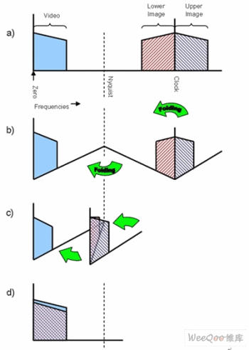 奈奎斯特頻率為時鐘頻率的一半,這是一項關(guān)鍵指標,因為在對原始模擬信號量化之前,必須把高于奈奎斯特頻率的視頻和噪聲禁止掉。如果存在高于奈奎斯特頻率的信息,它將混入低頻信號,產(chǎn)生混疊失真,從而破壞視頻信號。產(chǎn)生混疊后將無法消除,我們在后續(xù)內(nèi)容中將解釋這一點對家庭視頻系統(tǒng)的重要性。