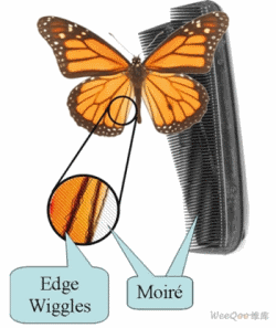 為了反映鏡像邊帶沒有衰減的效果,圖3b和3c示意了奈奎斯特頻率和時鐘頻率處的頻譜重疊。這些疊加的鏡像邊帶信號(圖3d)與視頻信號相比具有隨機的相位差。圖4表示我們需要避免的圖像誤差!斑吘墧[動”是高頻邊緣干擾,它重疊在視頻信號上,具有隨機變化的相位。摩爾效應是時鐘、視頻信號頻率之間相互作用的結(jié)果。