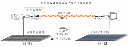 第二種方案是使監(jiān)控傳輸上的設(shè)備各點(diǎn)的相對地的電勢相同,一種方法是用一根導(dǎo)線把前端設(shè)備與后端設(shè)備的地連起來,但導(dǎo)線本身也存在電阻,效果并不是非常好,并且還需另外布線,增加了工程的復(fù)雜性;第二種方法是采用屏蔽的雙絞線,可是必然會對視頻信號有損耗,從而縮短傳輸距離。